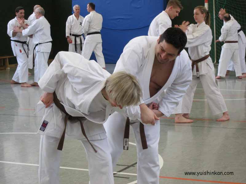 Im ersten Teil wurde zunächst nach der Japanischen Methode trainiert (Kihon-Ido und Partnerformen) um dann im zweiten Teil zu mehr vom Okinawa Karate geprägten Methoden zu wechseln. Hier wurden dann Partnerformen mit verschiedenen Kakie-Formen durch die beiden Referenten vorgestellt und durch die ausführlich Teilnehmer geübt.