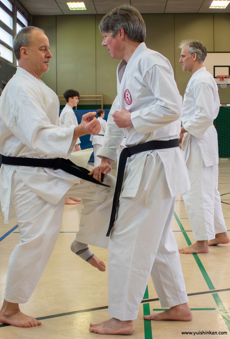 Beim Stilrichtungs-Lehrgang wurde das Thema Yakusoku Kumite behandelt. Nach einem an die winterlichen Temperaturen angepassten Aufwärmprogramm wurde der Begriff Yakusoku kurz erläutert, und die verschiedenen Formen des Yakusoku Kumite in der Stilrichtung wurden betrachtet, insbesondere im Hinblick auf die Vor- und Nachteile dieser Übungsform.