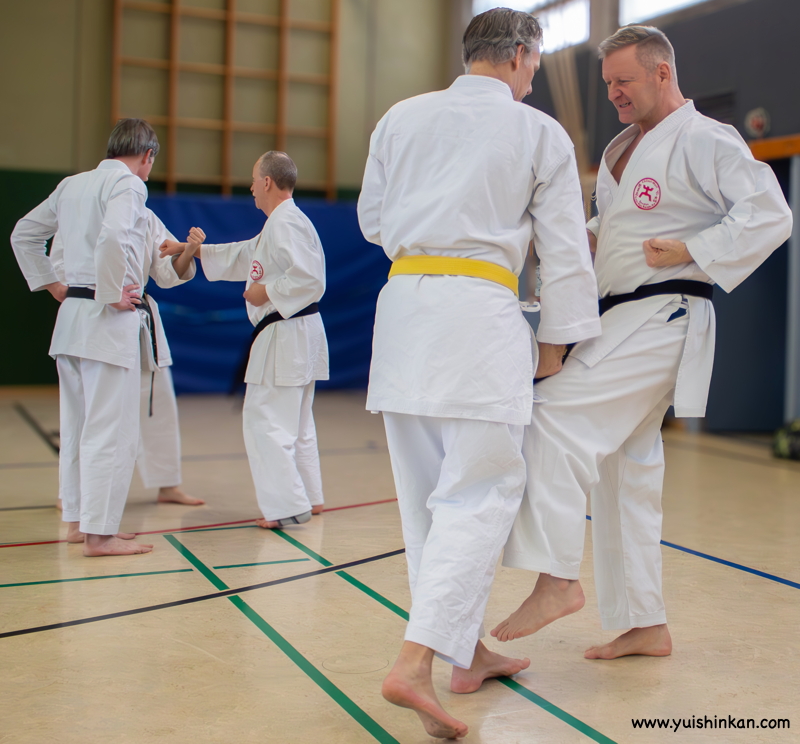 In der praktischen Einheit wurden die Kumite Ura 1 bis 6 mit Partnern erarbeitet. Dabei wurde von den Lehrgangsteilnehmern herausgearbeitet, welche Gemeinsamkeiten die Kumite Ura aufweisen und welche Grundprinzipien daraus abgeleitet werden können.