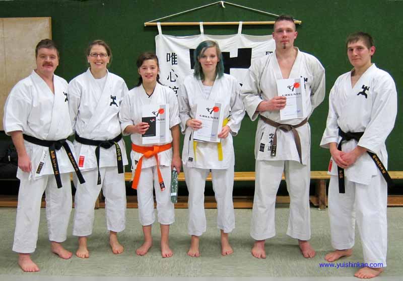 Gezeigt wurden Kihon Ido, Kata, Yakusoku-Kumite, und zum 2.Kyu zusätzlich Kata Bukai und Goshin-Jitzu-Kumite.