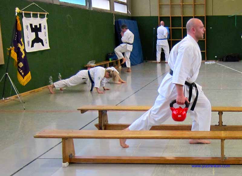 Neben dem eigentlichen Prüfungsprogramm wird im Yuishinkan Goju Ryu auch die Kondition getestet und so kamen die Teilnehmer zum Schluss bei Liegestützen, Haras etc. noch mal ordentlich ins Schwitzen.
