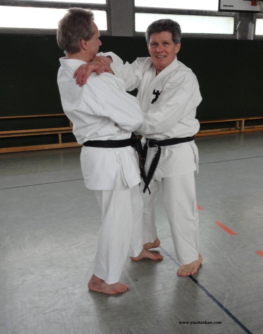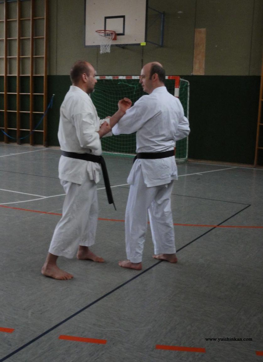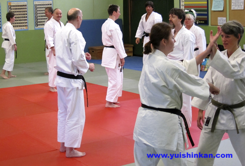 Nach der Kaffeepause wurde die Gruppe geteilt. Während Fritz Nöpel die Späteinsteiger im Makiwara-Training unterwies, ließ Martin Nienhaus die Jukuren Partnerformen üben, und zwar anhand der Tiere in der Kampfkunst. Es wurden verschiedene Varianten mit Partner und als Selbstverteidigung im Kreis trainiert, wobei nicht nur die typischen Techniken und Bewegungsabläufe erarbeitet wurden, sondern auch die Vielfalt deutlich wurde, die in den einzelnen Techniken und Kombinationen steckt.