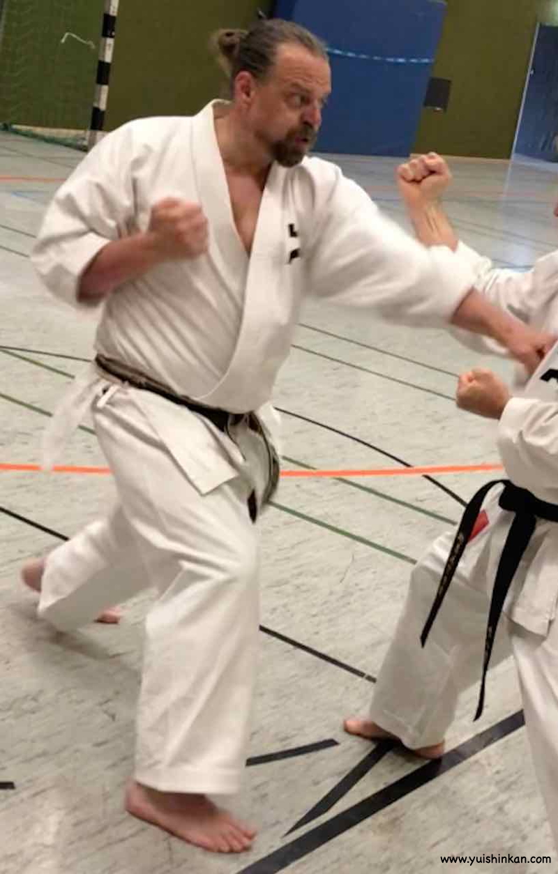Dann ging es los mit der Aufwärmgymnastik, wobei hier auch schon mit dem Partner gearbeitet wurde. Christian wies darauf hin, dass alle Techniken aus dem Hara heraus erfolgen müssen. Hierzu gab es eine nicht unanstrengende Übung in der Bauchlage. Anschließend wurden die im Goju Ryu vorkommenden Stände durchgegangen und danach Techniken im Stand (Yoko Uke, Haraiotoshi Uke, Age Uke, Tsuki Chudan) geübt. Hierbei wurde ein Hauptthema des Trainings angesprochen, nämlich die richtige geistige Einstellung. Das heißt, schon im Kihon beziehungsweise Kihon Ido Training muss mit absoluter Konzentration und Aufmerksamkeit (auch bekannt als Zanshin) gearbeitet werden. Dazu gehört auch die richtige Atmung und die korrekte Ausführung der Techniken, etwas die Fausthaltung. In diesem Zusammenhang wurde der Begriff „Ichi go Ichi“ eingeführt, der sich in etwa übersetzen lässt als „es gibt nur eine Gelegenheit“. Wenn diese Einstellung schon im Kihon trainiert würde, kann sie später beim Partnertraining oder in einem wirklichen Kampf einen Unterschied ausmachen.