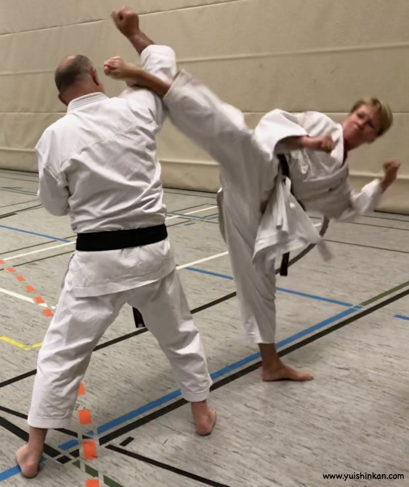 Weiter ging es mit Uraken Uchi und Shuto Uchi. Wie schon zuvor, erfolgten auch hier Hinweise zur korrekten Ausführung. Mit dem Partner wurden Mae Geri und Kin Geri geübt. Wichtig war hierbei, dass Uke nicht passiv ist, sondern die gleiche Konzentration und Aufmerksamkeit wie Tori hat. In einer Übung zu diesem Aspekt musste Tori mit Gyaku Tsuki angreifen, aber so, dass er nicht verrät, wann er stoßen will, und der Partner musste mit Soto Uke abwehren, wobei er Tori genau beobachten sollte, um zu erkennen, wann dieser zum Stoß ansetzt.