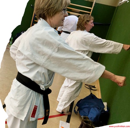 Im praktischen Teil wurden dann zunächst verschiedene Basis-Übungen als Hinführung zur Kata durchgeführt. So wurden zum Beispiel mit dem Partner Doubletten geschlagen und hierbei auf die korrekte Faust- und Armhaltung und die Lage des Ellbogens geachtet. An der Pratze wurde der Zuki geübt. Weiterhin wurden die in der Kata vorkommenden Dachi Waza eingehend betrachtet, das heißt, es wurden die zugrunde liegenden Bewegungsprinzipien erklärt und anschließend geübt. Zum Aspekt der Abhärtung von Körper und Geist gab es Hinweise dazu, wie am Makiwara gearbeitet werden sollte und es wurde mit dem Partner Soto Uke beziehungsweise Soto Uke – Yoko Uke - Harai Otoshi Uke geschlagen. Als Beweglichkeitsübung wurde noch die Kombination Teisho – Kake Uke gemacht.
