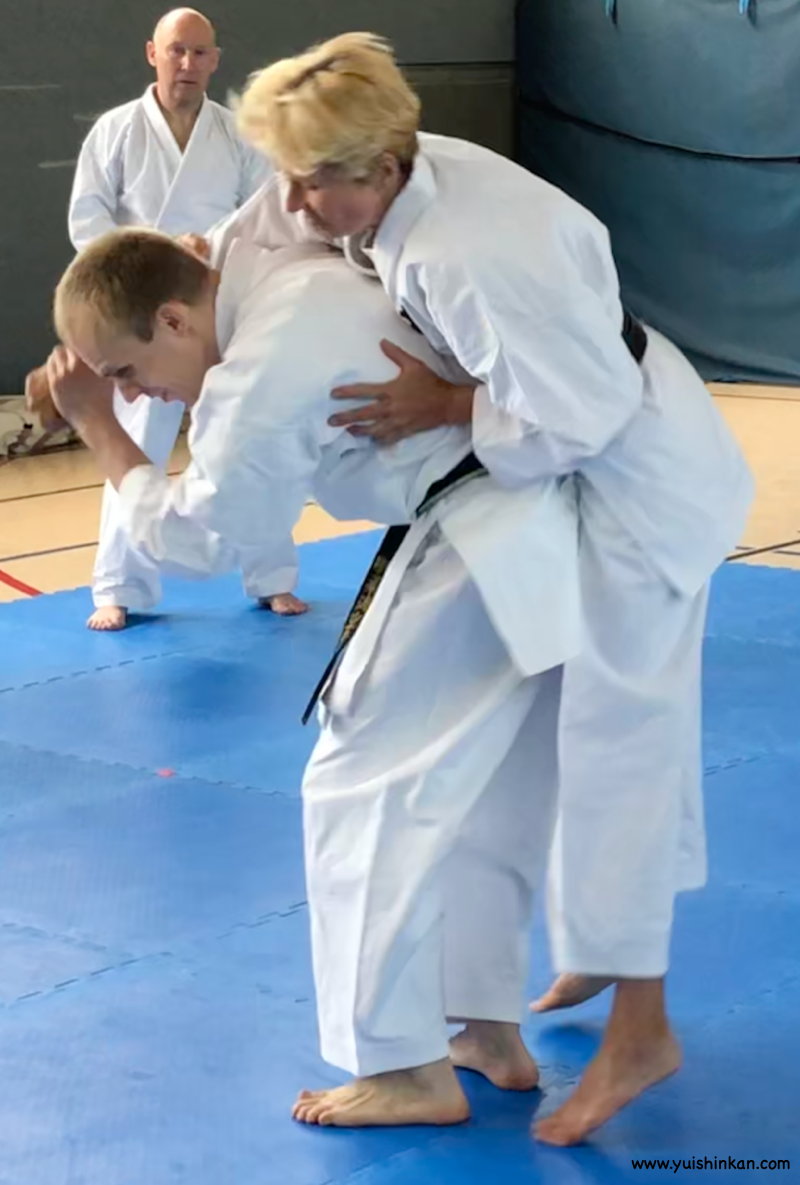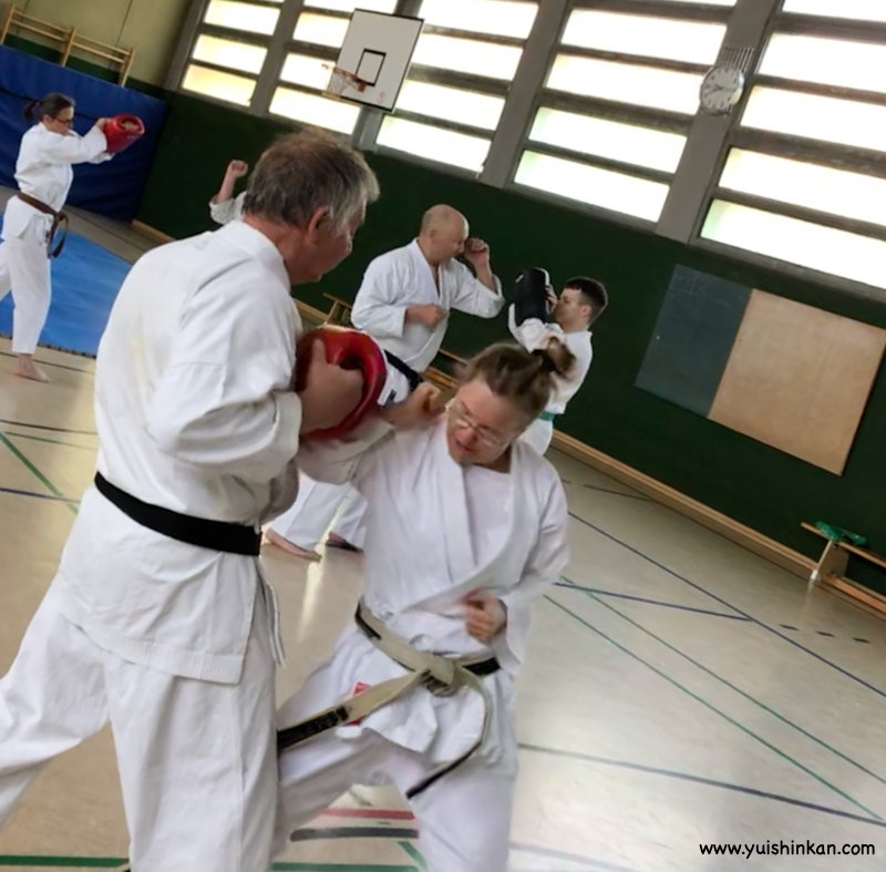 Die Kumite Ura Nr. 1 wurde dann zunächst als Soloform und Kihon-Ido-mäßig und anschließend mit dem Partner geübt, wobei Felix Hinweise zu grundlegenden Bewegungsprinzipien gab. Das Dilemma der Kumite Ura Formen, so die Erkenntnis, besteht darin, dass wenn der Konter gut gemacht wird, der Angreifer besiegt ist.