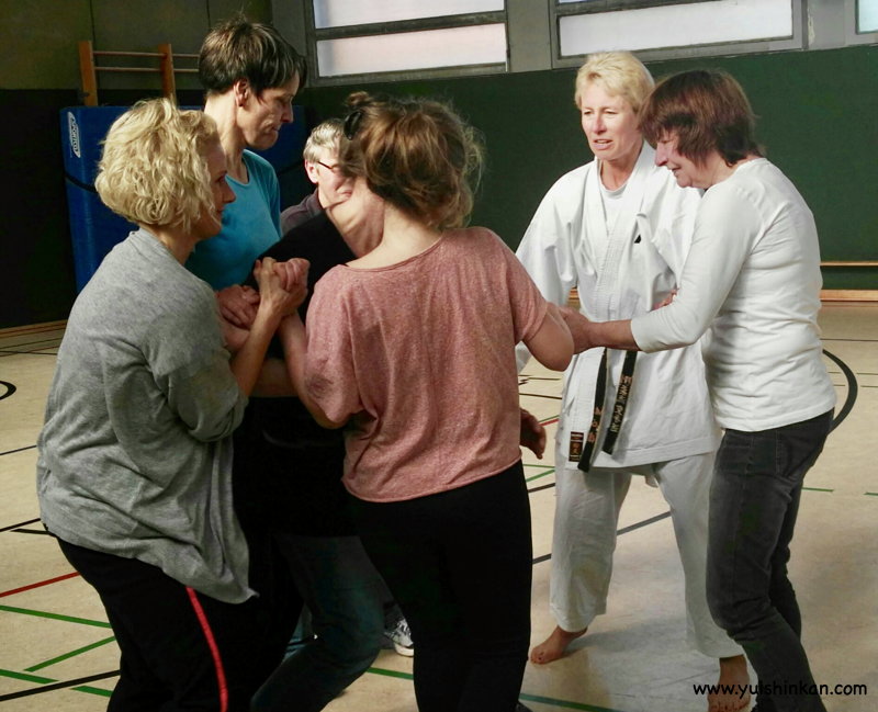 An drei aufeinander folgenden Samstagen im Februar bot Manuela Schäfer, 5. Dan, einen Selbstbehauptungs- und Selbstverteidigungskurs für Frauen an. In der theoretischen Einführung erläuterte Manuela zunächst den Grundsatz, dass Selbstverteidigung im Kopf beginnt. Hierzu gehören Wachsamkeit im Alltag und die Bewusstheit über gefährliche Situationen.
