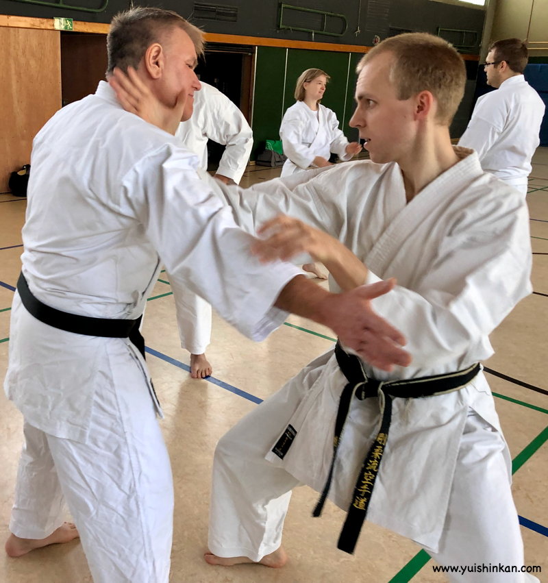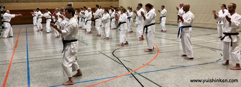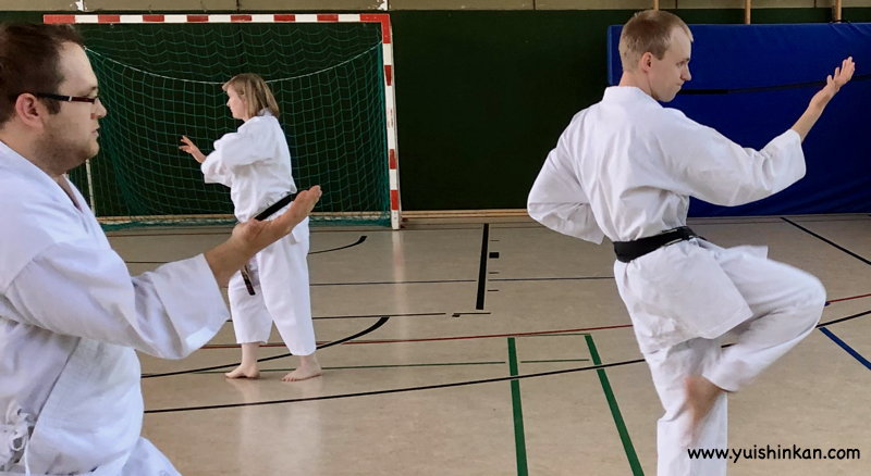 Der Ablauf der Sepai wurde ebenfalls trainiert, wobei die Kata in Abschnitte aufgeteilt wurde. Hier ergab sich unter anderem die Frage nach der Drehbewegung der Füße. Drehen beide Füße auf den Ballen, auf den Ferse oder dreht ein Fuß auf dem Ballen und der andere auf der Ferse? Die unterschiedlichen Ansichten hierzu wurden in der Gruppe diskutiert. Letztendlich kommt es darauf an, wie der Gegner angreift, wie die Größenverhältnisse zwischen Angreifer und Verteidiger sind und welche Absichten ich als Verteidiger verfolge.