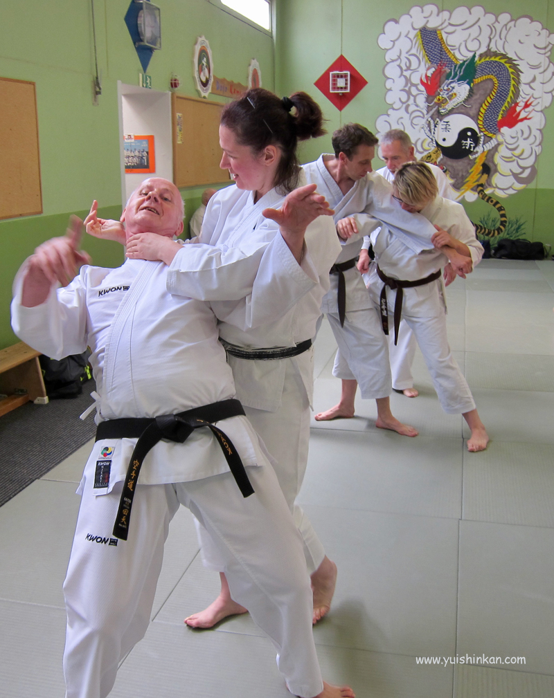 Mit dem Partner wurden dann verschiedene Formen der Abwehr gegen einen Packversuch trainiert, wobei die 12 Fäuste als Konter zum Einsatz kamen.